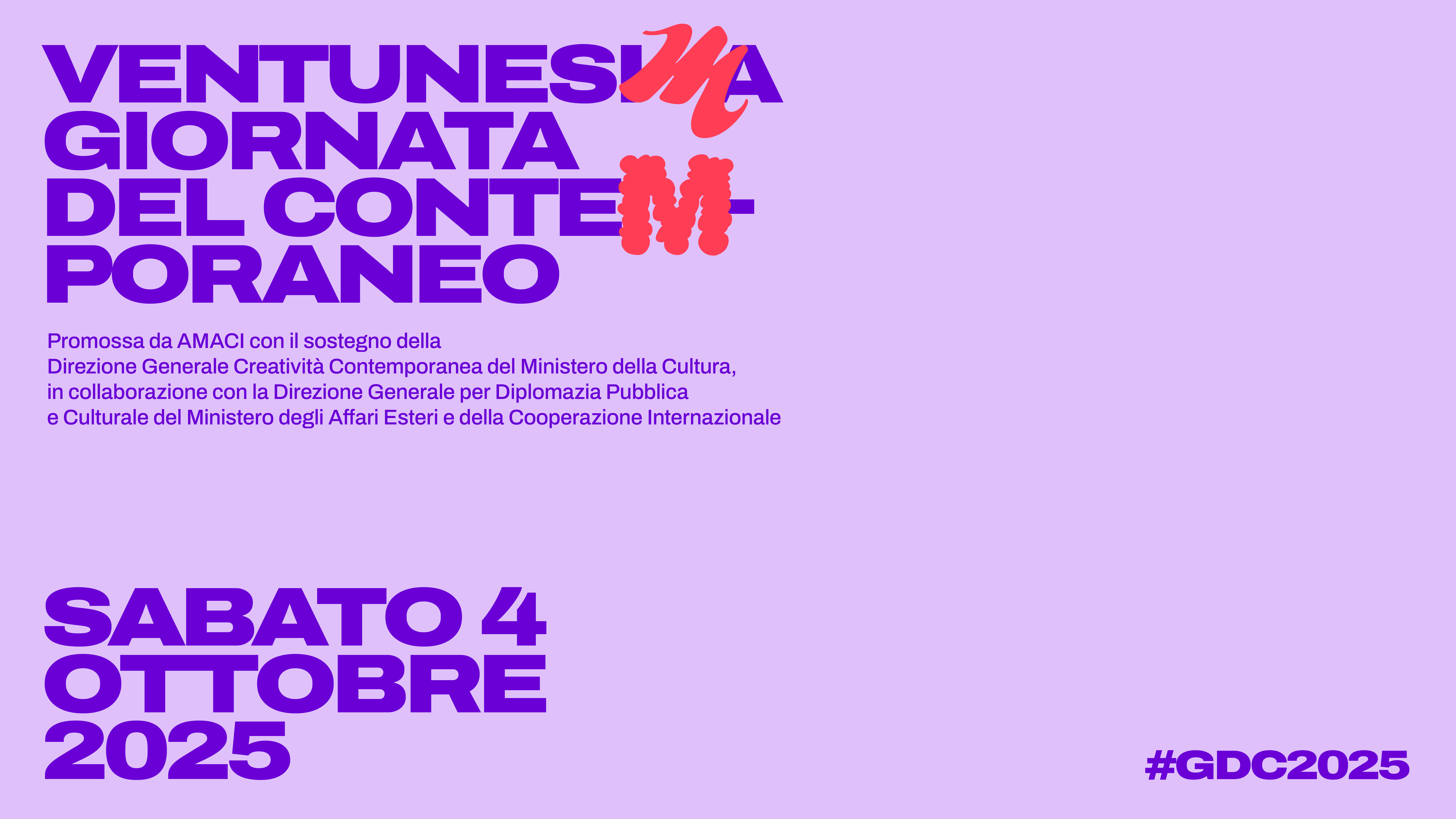 Sabato 4 ottobre 2025 si celebra la ventunesima edizione della Giornata del Contemporaneo, la grande manifestazione annuale promossa da AMACI con il sostegno della Direzione Generale Creatività Contemporanea del Ministero della Cultura e in collaborazione con la Direzione Generale per la diplomazia pubblica e culturale del Ministero degli Affari Esteri e della Cooperazione Internazionale. Per il ventunesimo anno consecutivo, i 26 musei associati ad AMACI, insieme a oltre mille realtà pubbliche e private in tutta Italia, apriranno gratuitamente le loro porte al pubblico, con una programmazione speciale di mostre, eventi, laboratori e iniziative, in presenza e online, pensate per avvicinare l’arte contemporanea a un pubblico sempre più ampio e trasversale. Come nelle ultime edizioni, anche quest’anno la Giornata del Contemporaneo supera i confini nazionali, estendendosi all’estero fino al 10 ottobre 2025 con il progetto Giornata del Contemporaneo | Italian Contemporary Art, realizzato in sinergia con la rete diplomatico-consolare del MAECI – Ambasciate, Consolati e Istituti Italiani di Cultura – per promuovere e valorizzare l’arte contemporanea italiana nel mondo.